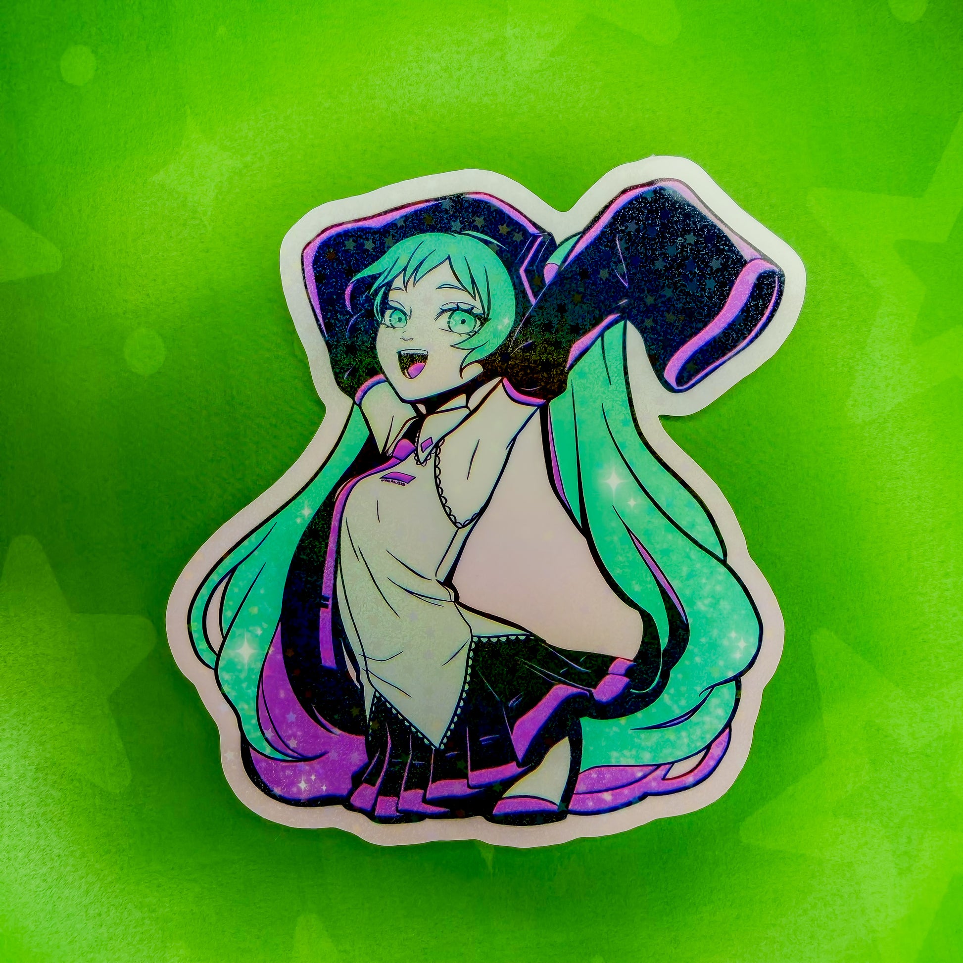Add some Vocaloid magic to your things with this 4 inch Hatsune Miku sticker, featuring a holographic star finish that sparkles beautifully in the light.